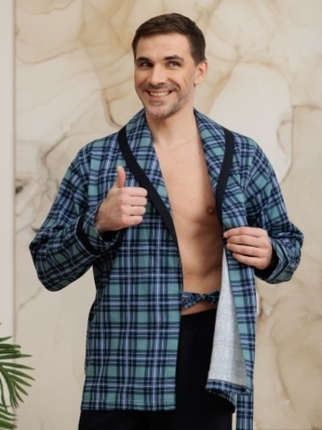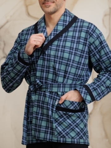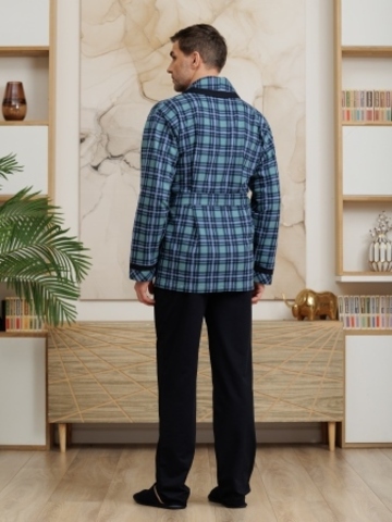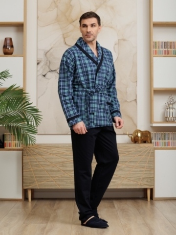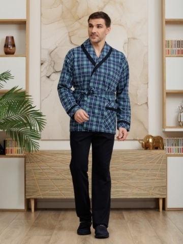 Стильный домашний костюм состоящий из брюк и жакета с отложным шалевым воротником под пояс, манжетами и накладным карманом. Брюки прямого кроя с втачными боковыми карманами и отрезной резинкой по талии прекрасно комбинируют со своим стильным верхом.