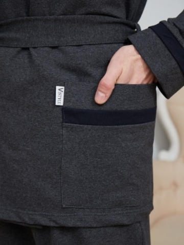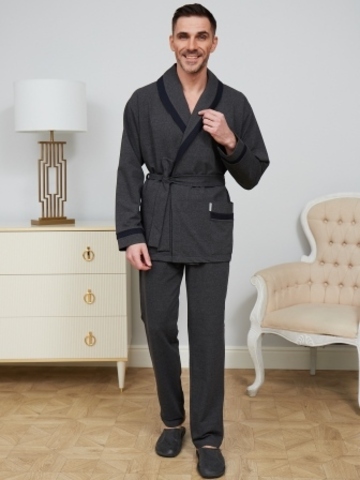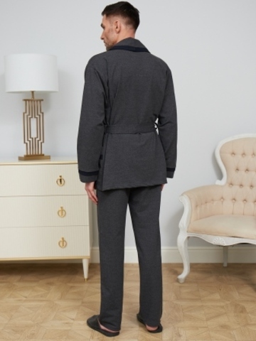 Стильный домашний костюм состоящий из брюк и жакета с отложным шалевым воротником под пояс, манжетами и накладным карманом. Брюки прямого кроя с втачными боковыми карманами и отрезной резинкой по талии прекрасно комбинируют со своим стильным верхом.