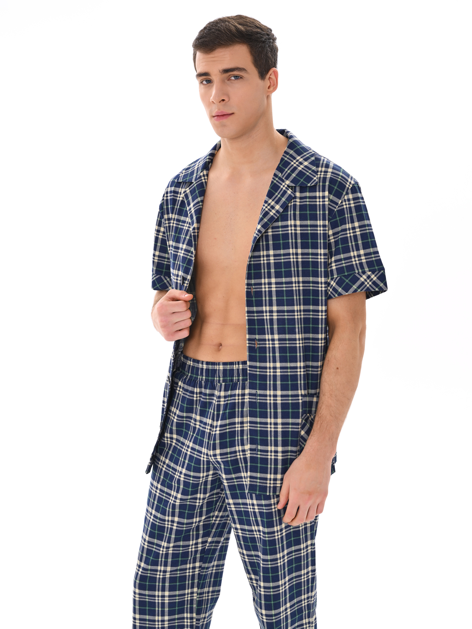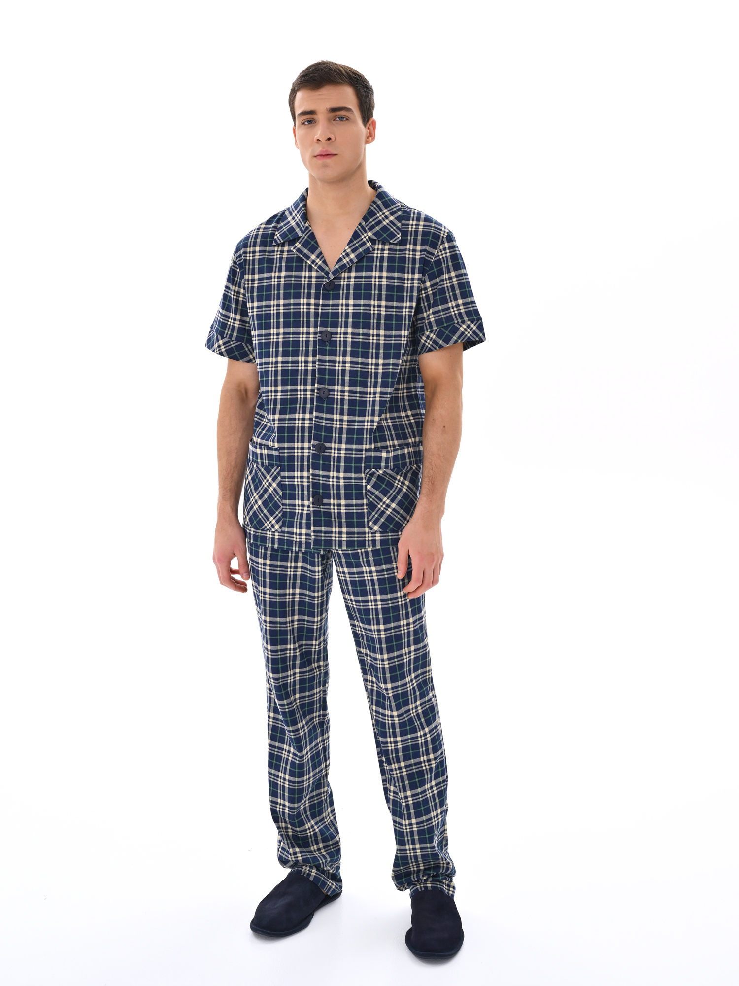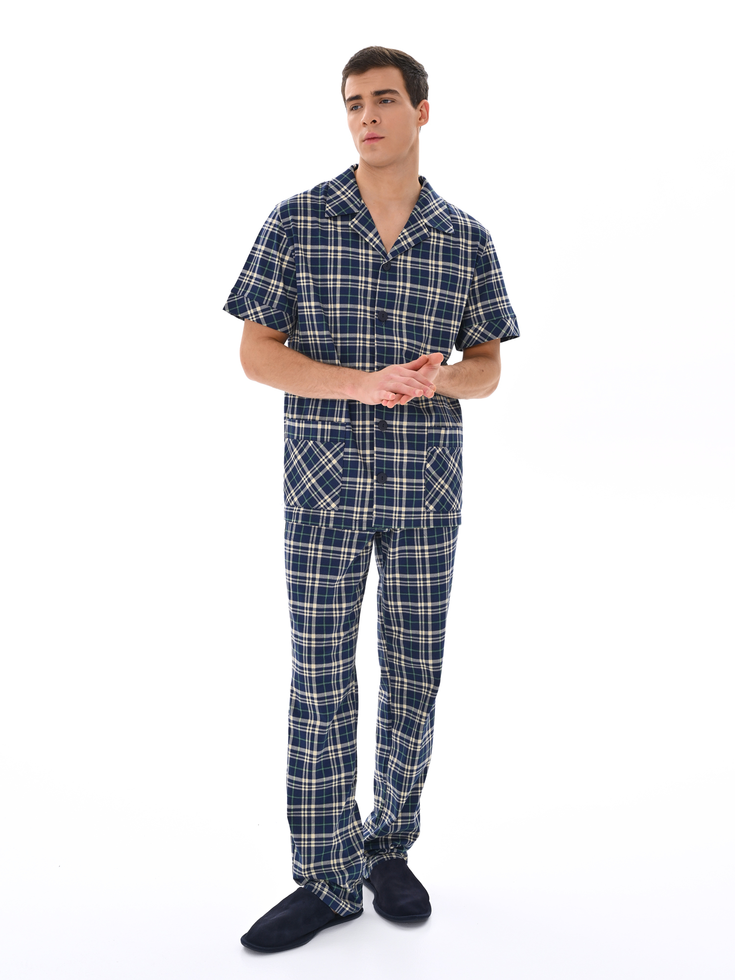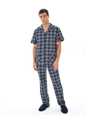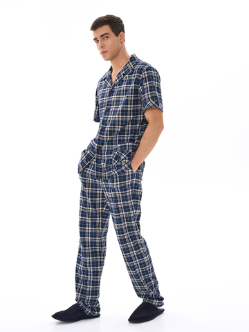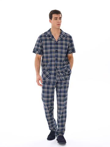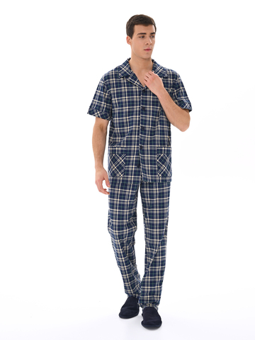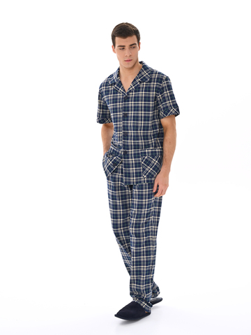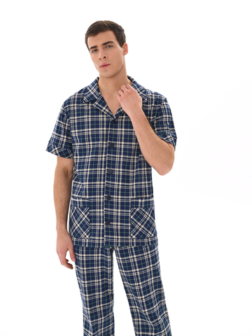 Современный мужской костюм, состоящий из кофты с рубашечным воротником на пуговицах, имеются два накладных кармана. Брюки среднего объёма, цельнокроеный пояс с резинкой. Отличный вариант для дома и отдыха.