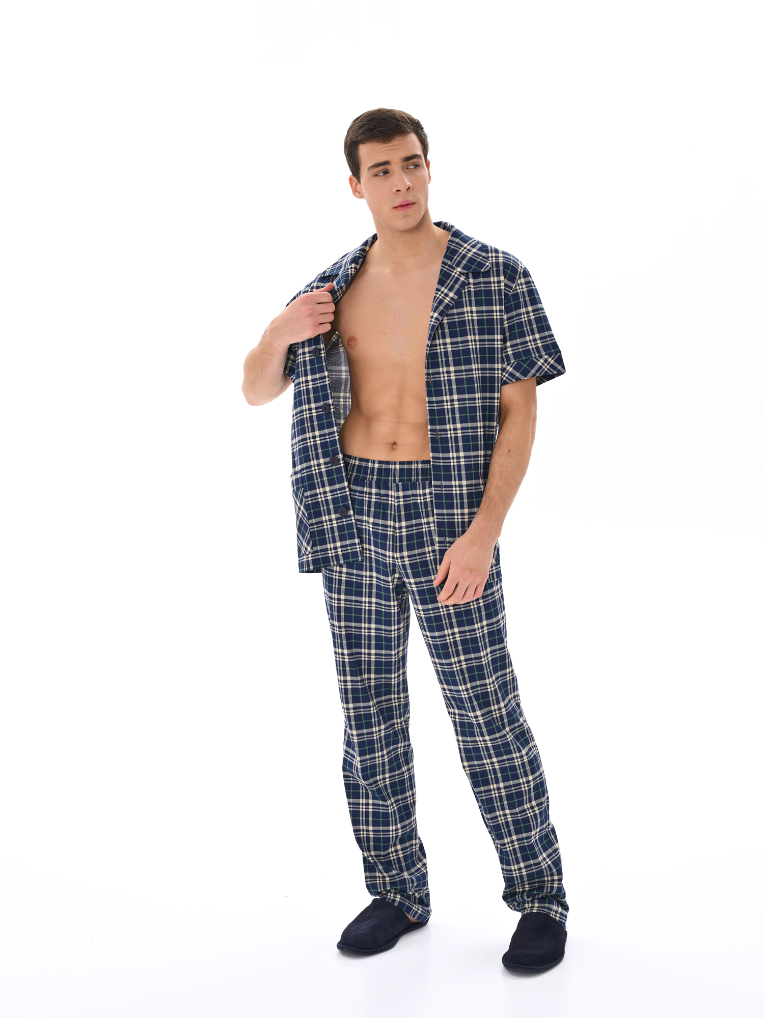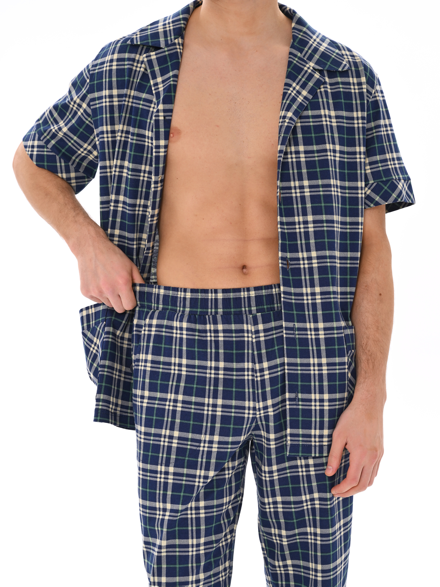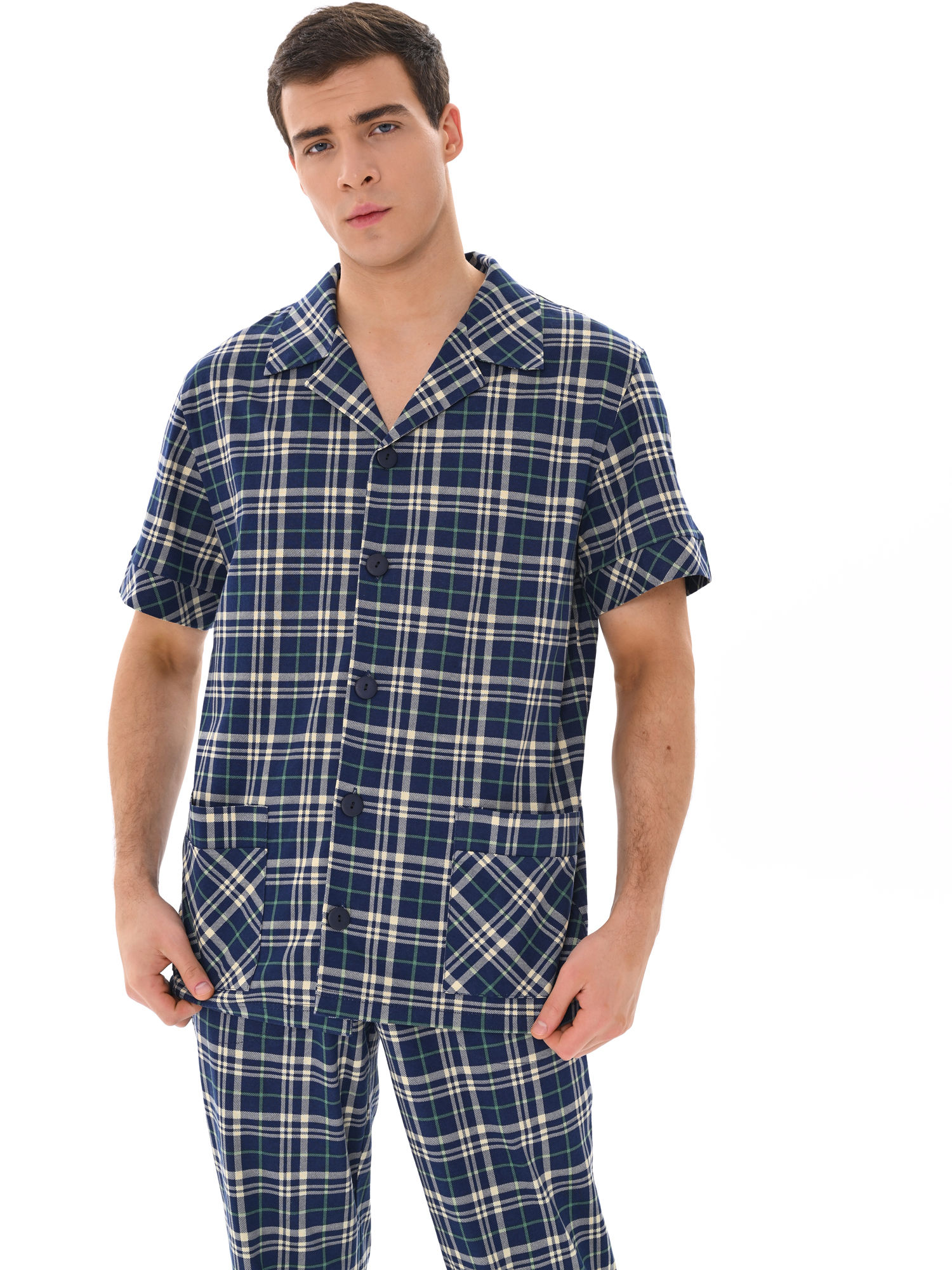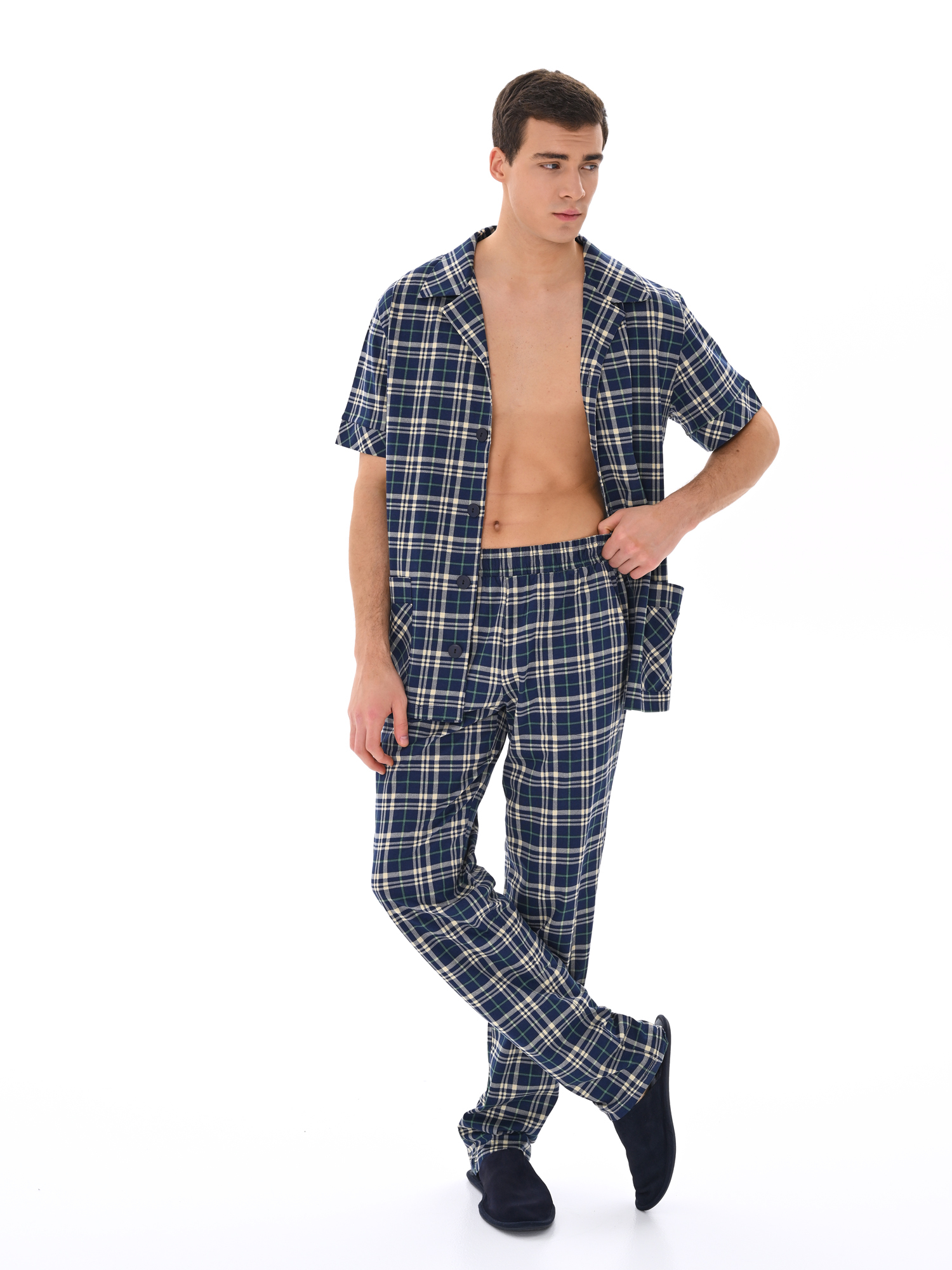 Современный мужской костюм, состоящий из кофты с рубашечным воротником на пуговицах, имеются два накладных кармана. Брюки среднего объёма, цельнокроеный пояс с резинкой. Отличный вариант для дома и отдыха.