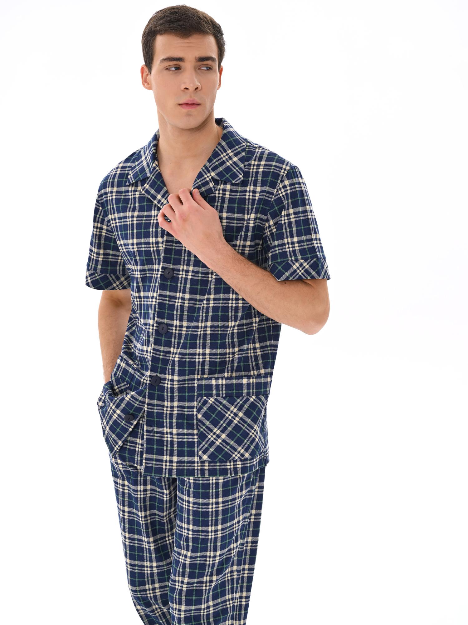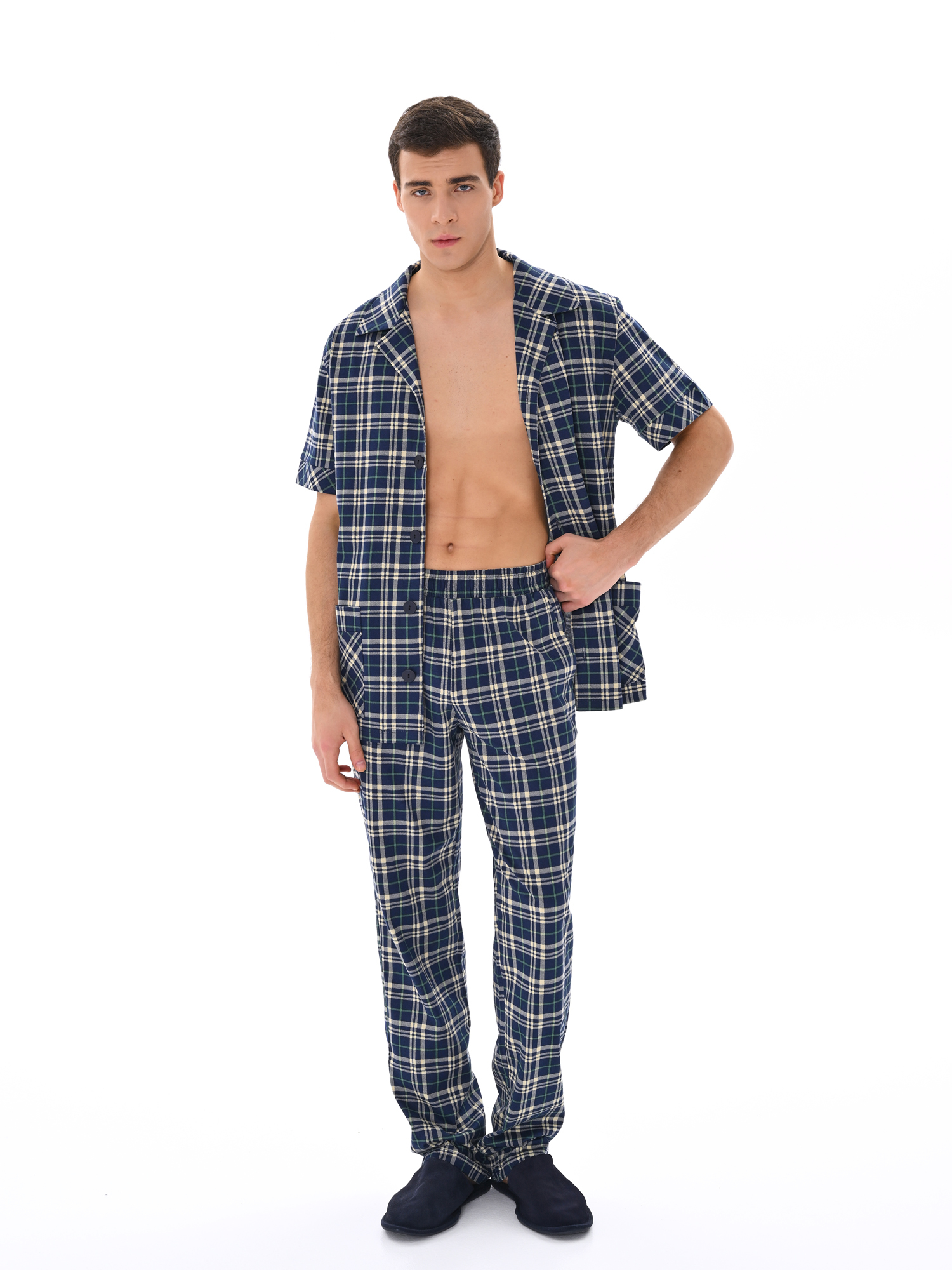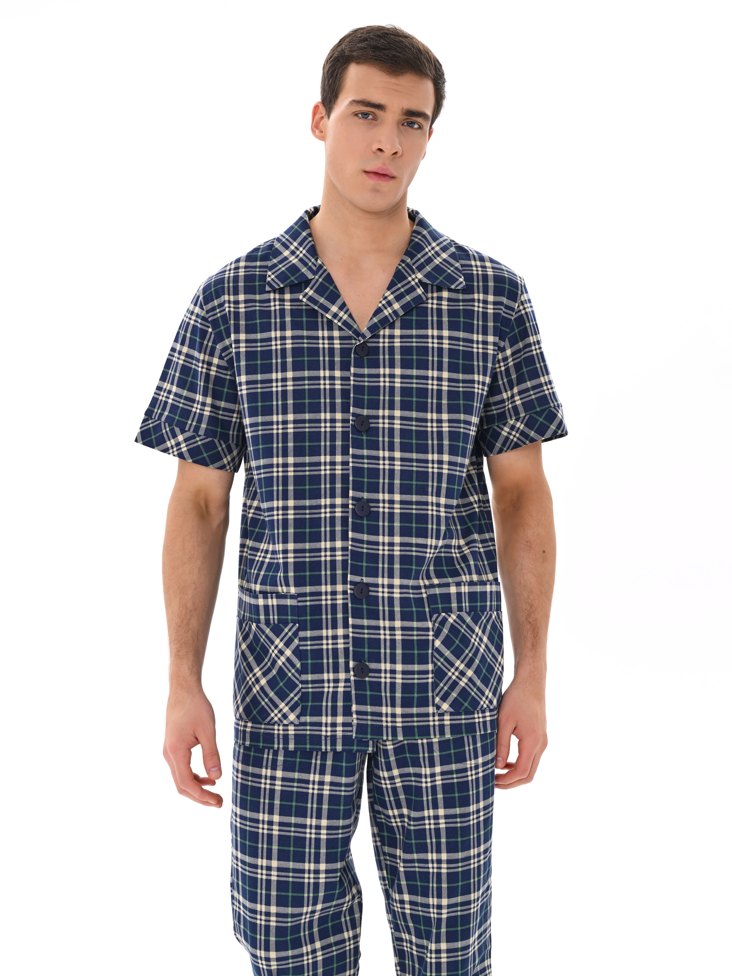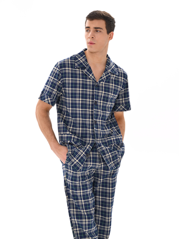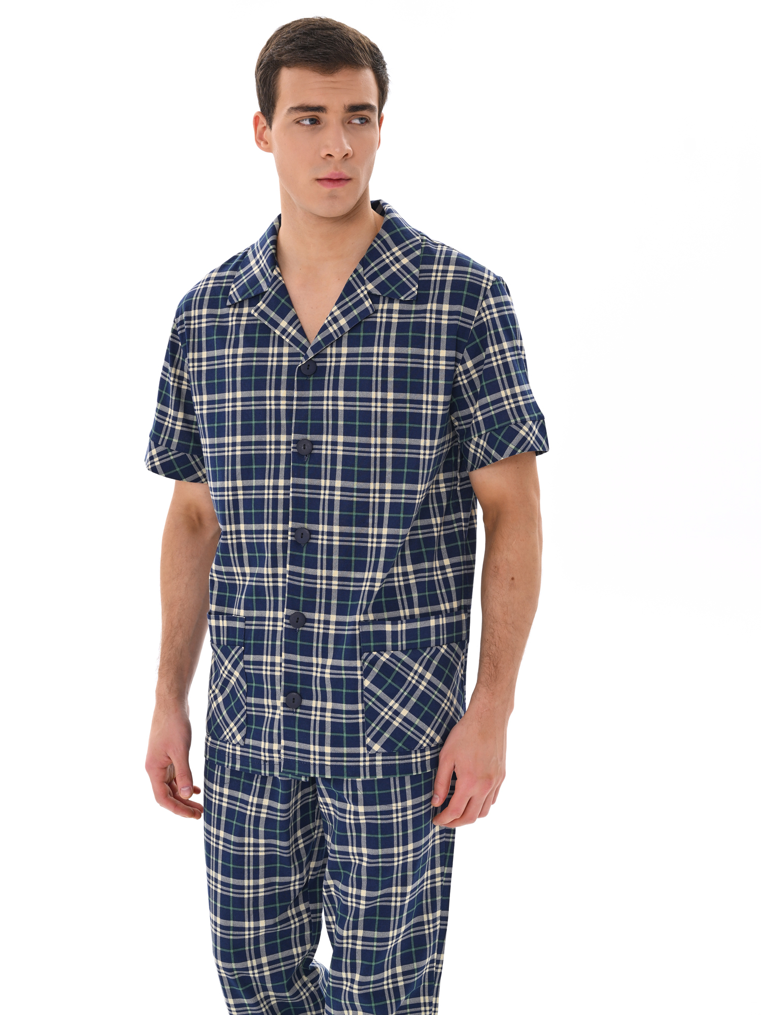 Современный мужской костюм, состоящий из кофты с рубашечным воротником на пуговицах, имеются два накладных кармана. Брюки среднего объёма, цельнокроеный пояс с резинкой. Отличный вариант для дома и отдыха.