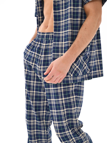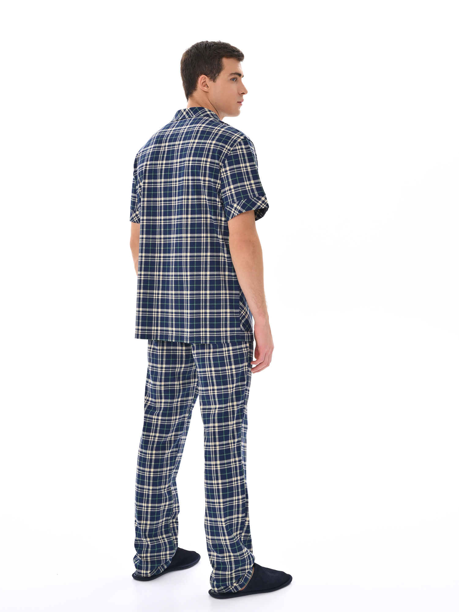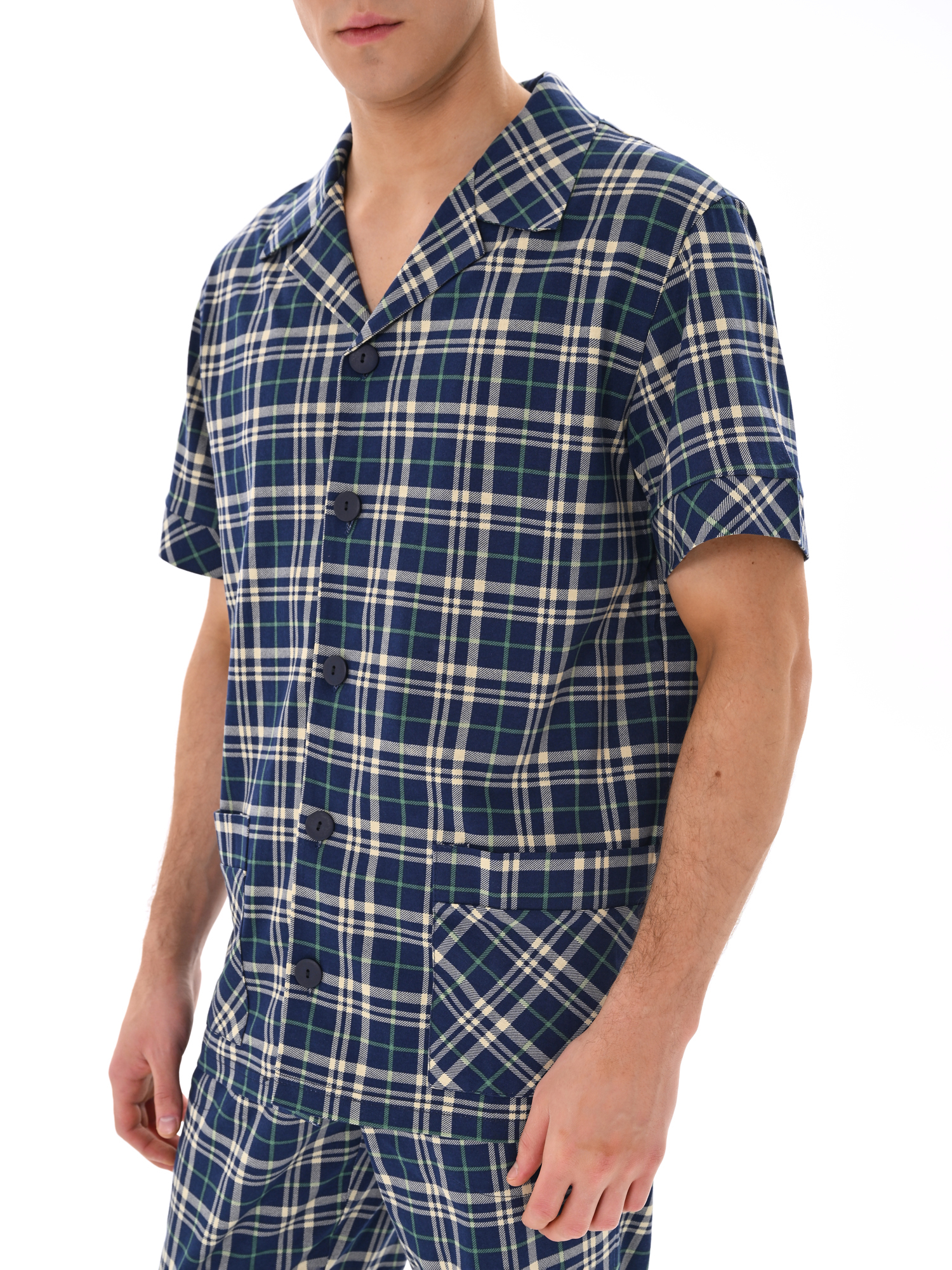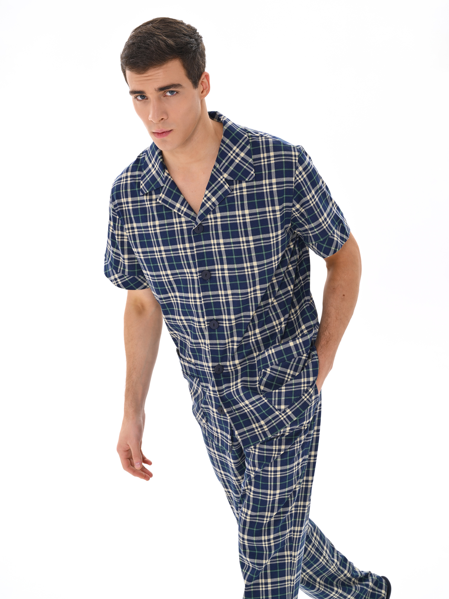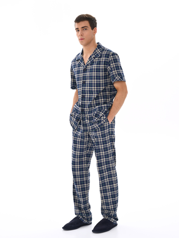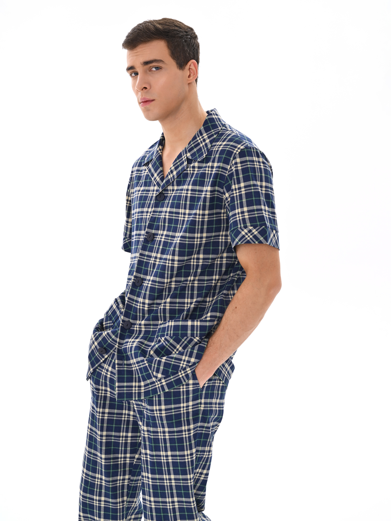 Современный мужской костюм, состоящий из кофты с рубашечным воротником на пуговицах, имеются два накладных кармана. Брюки среднего объёма, цельнокроеный пояс с резинкой. Отличный вариант для дома и отдыха.