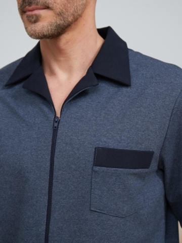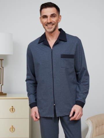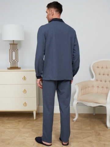 Современный мужской костюм, состоящий из кофты с рубашечным воротником на молнии, имеются нагрудный карман и два накладных кармана. Брюки среднего объёма, цельнокроеный пояс с резинкой. Изделие выполнены из мягкого комфортного материала футера. Отличный вариант для дома и отдыха.